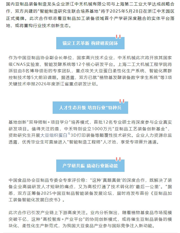 產(chǎn)教融合再添標桿!中禾機械聯(lián)袂上海二工大打造豆制品裝備研發(fā)新高地