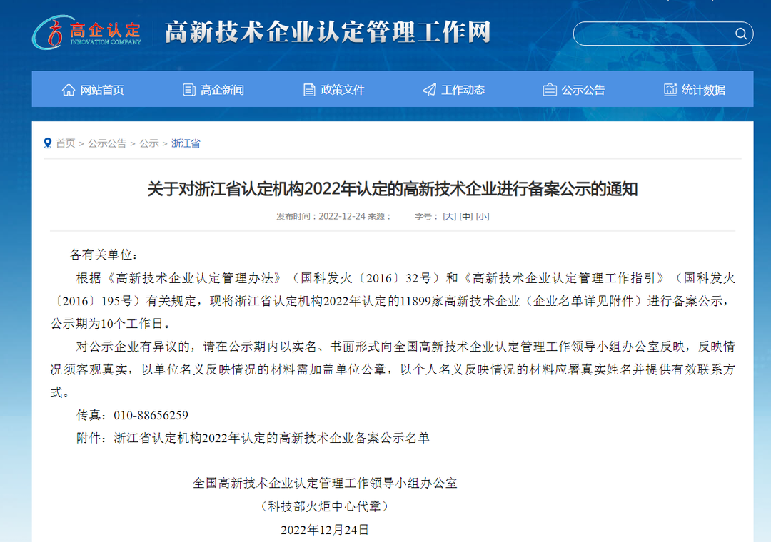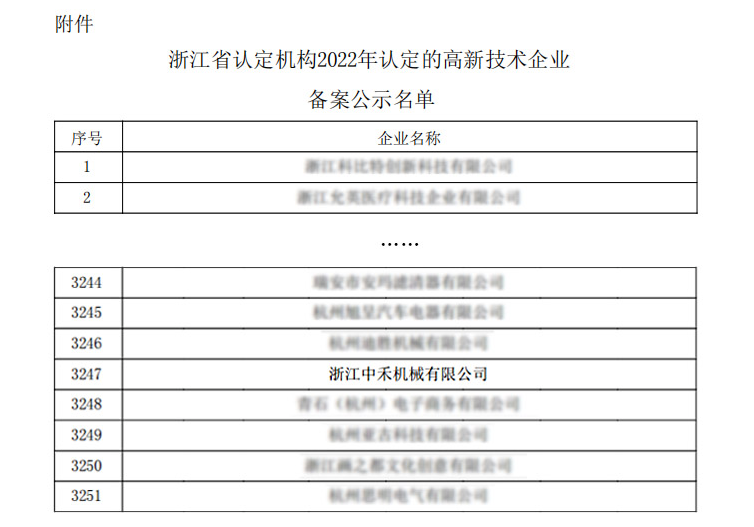 2022年12月24日,全國高新技術(shù)企業(yè)認(rèn)定管理工作領(lǐng)導(dǎo)小組辦公室發(fā)布了《關(guān)于對浙江省認(rèn)定機(jī)構(gòu)2022年認(rèn)定的高新技術(shù)企業(yè)進(jìn)行備案公示的通知》,浙江中禾機(jī)械有限公司榮獲“國家高新技術(shù)企業(yè)”稱號。